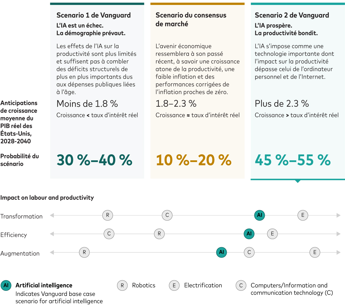 Vanguard présente deux scénarios pour l'avenir. Dans le premier, le plus probable, l'IA s'impose comme une technologie polyvalente importante, dépassant l'impact de l'ordinateur personnel et de l'Internet sur la productivité. Dans l'autre, l'IA n’atteint pas les attentes, et n’entraîne que de modestes gains de productivité qui ne suffisent pas à combler les déficits structurels dus aux dépenses publiques liées au vieillissement de la population.